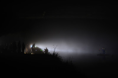 Noemí Fidalgo sale detrás de una de las patas (hasta el nombre es teatral) del puente. La barcaza da una primera vuelta a la pata en silencio. Vuelve a aparecer con un sonido de gaita sostenido y monocorde. El puente resuena y rebota en el río y la noche. Los coches rompen con luces y motor al cruzar el puente. En una tercera vuelta se superponen dos sonidos, la resonancia crece. La contemplación, en este caso un estado de alma y oído, está hecha.