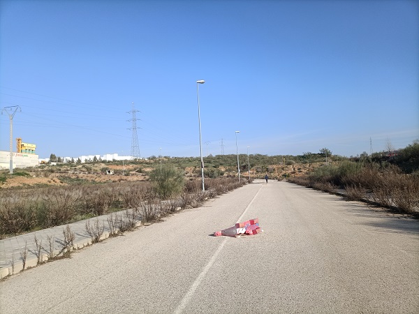 La M-203 es una carretera fantasma que tiene un final, nunca acabó de construirse y, por eso, termina. El paseo dura varias horas, empieza en el tanatorio, luego atravesamos un campo de flores, contra el cielo zumban aviones de lata y chisporrotean las torres de alta tensión, hasta que salimos a la carretera. La última parada es en una cuneta donde, entre las matas blancas, hay un coche calcinado. Nos sentamos de frente, como en un cine y leemos el final del relato de María Bastarós, cuando cambia la suerte de las chicas de Alcàsser y el de las niñas que desde los ‘90 se enfrentan al miedo de subir solas a un coche desconocido. Su final alumbra en el grupo de participantes a la sesión el pensamiento de que Camila Cañeque sigue viva.